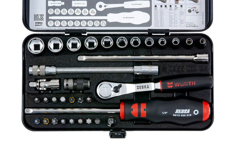 📌 Technische Details: • Marke: Würth • Modell: 0965014340 • Antrieb: 1/4 Zoll • Inhalt: 34 Teile (Steckschlüssel, Verlängerungen, Knarren, Bits usw.) • Aufbewahrung: Robuste Metallkassette mit Hartschaumeinlage • Abmessungen der Box: 220 x 110 x 35 mm • Artikelnummer: 095501434 (Einlage) | 09557151 (Box)
